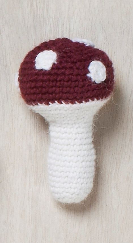 Kärpässieni-helistimellä leikkivät niin vauvat kuin isommatkin lapset. Sieniaiheinen helistin on virkattu kiintein silmukoin Novita Alpaca Wool -langasta.