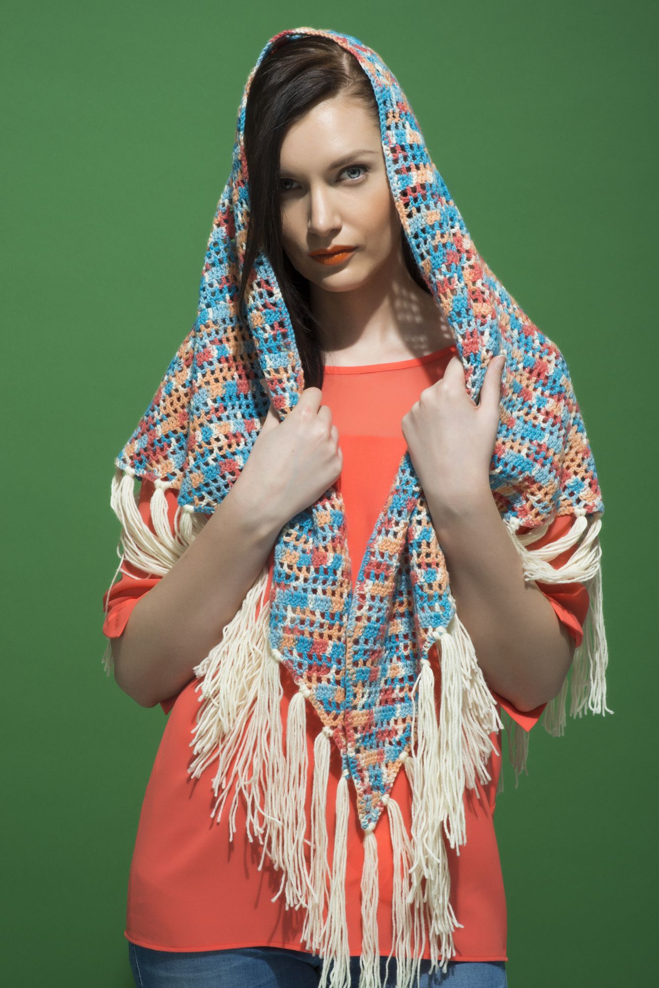 Hapsut: Leikkaa luonnonvalkoisesta langasta yhtä hapsua varten 6 kpl noin 45 cm pitkää lanka. Taita lankakimppu kaksinkerroin, vedä se virkkuukoukun avulla taitetusta päästään huivin reunan läpi, vedä avoin pää taitetun läpi ja kiristä. Kiinnitä hapsut noin 3 cm:n välein huivin sivuille ja kärkeen.
