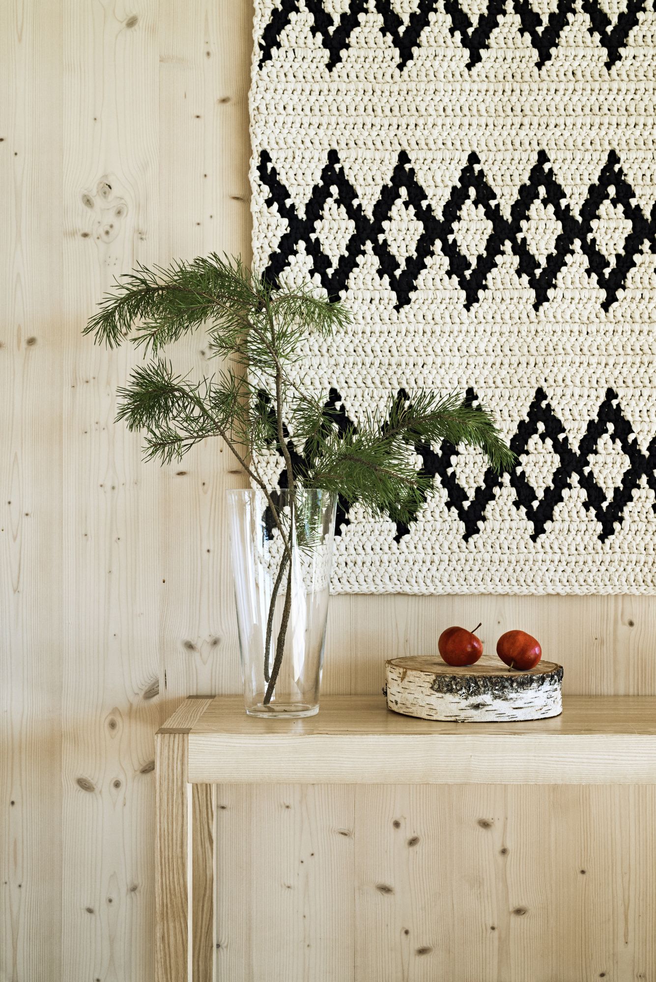 Virkattu, graafinen matto Novita Eko Tube -langasta toimii myös modernina seinävaatteena.