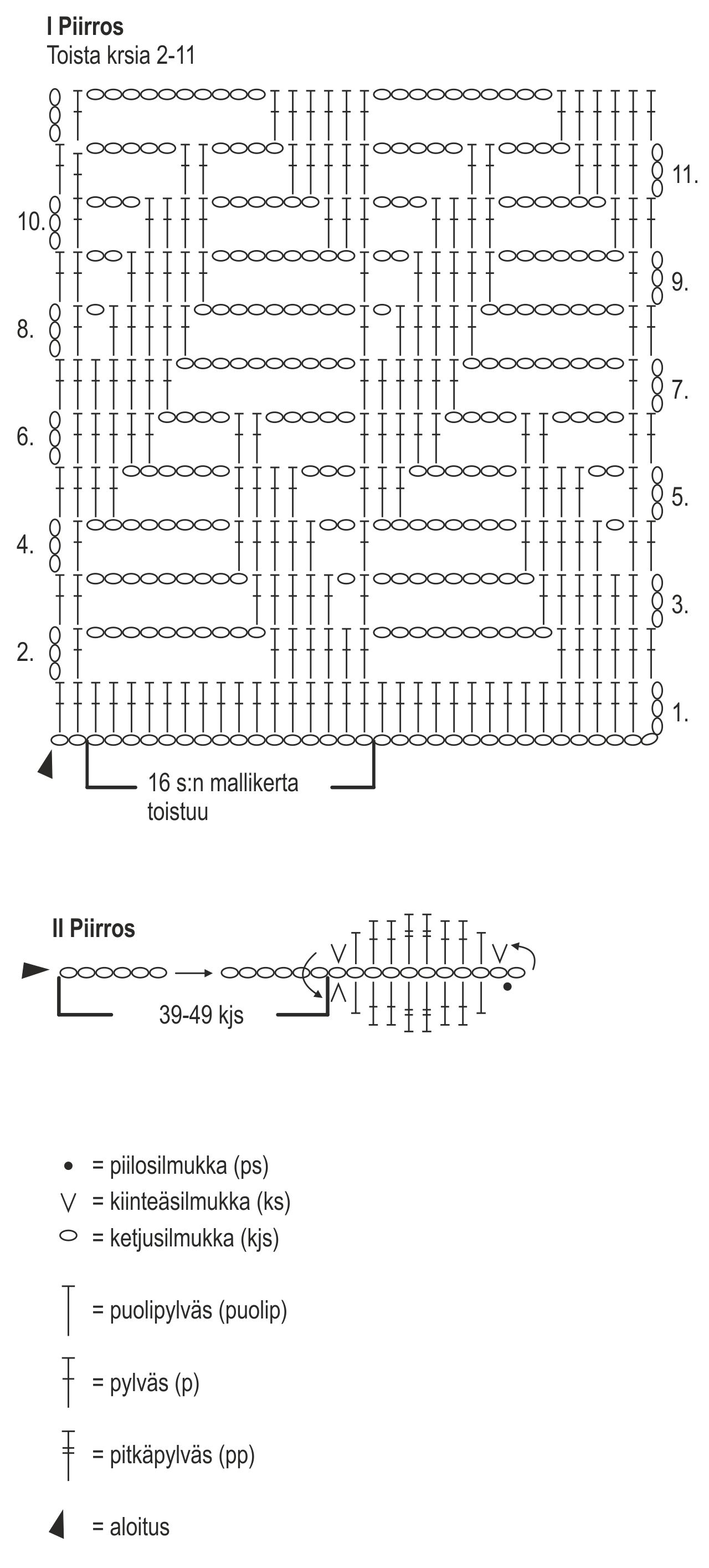 Virkkaa aloitusketjuksi löyhästi 98 kjs. 1. krs (ks. I piirros): virkkaa 3 kjs (= 1. p) kääntymiseen ja 1 p jokaisen aloitusketjun s:aan = 98 p. Jatka virkkaamista piirroksen 2. krs:lta ja toista krsia 2-11, kunnes huivin pituus on noin 180 cm ja olet viimeksi virkannut piirroksen 9. krs:n. Virkkaa lopuksi 3 kjs ja 1 p jokaiseen s:aan. Katkaise lanka.