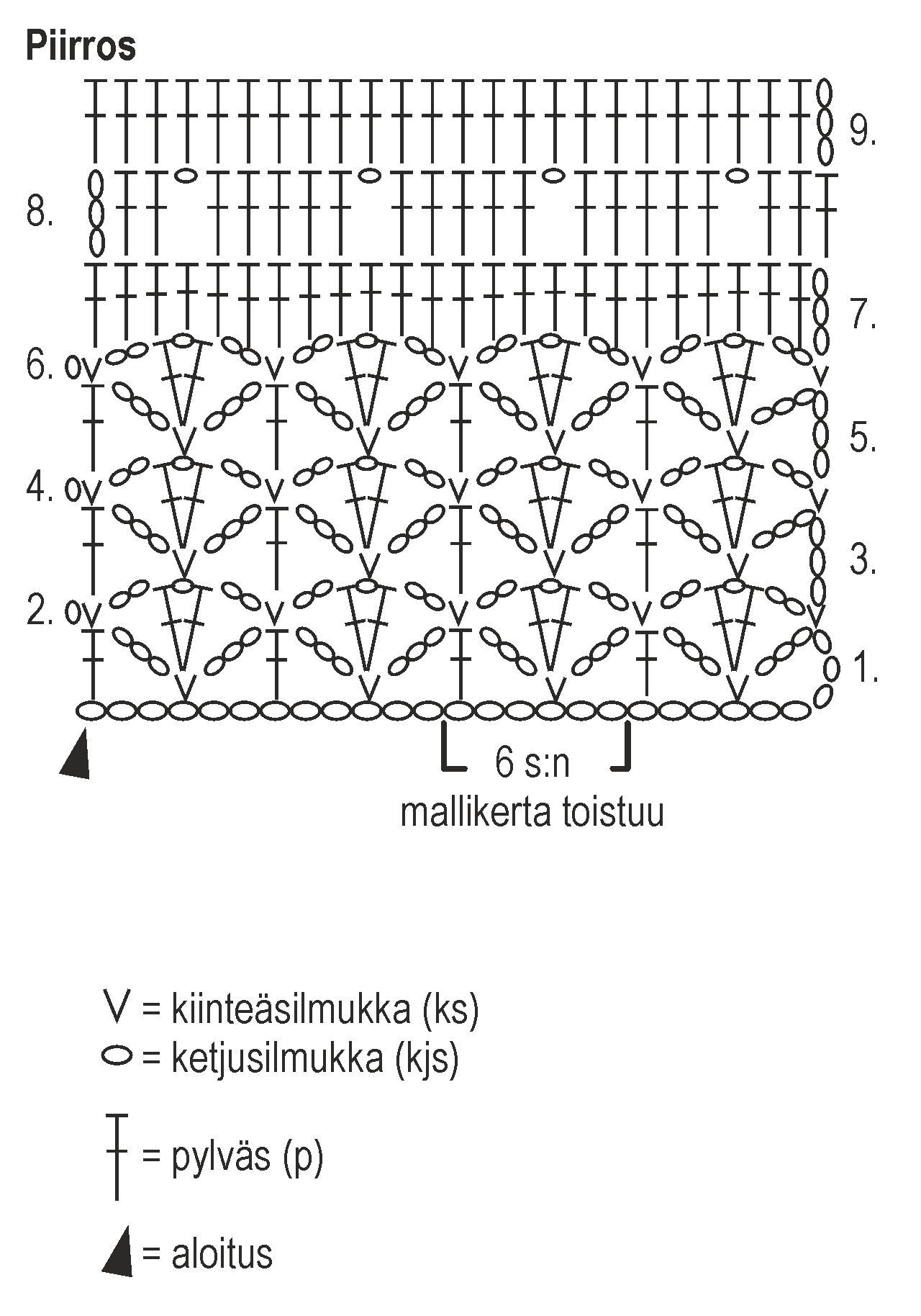Virkkaa ketjusilmukoita (kjs) ja pylväitä (p) piirroksen ja ohjeen mukaan.