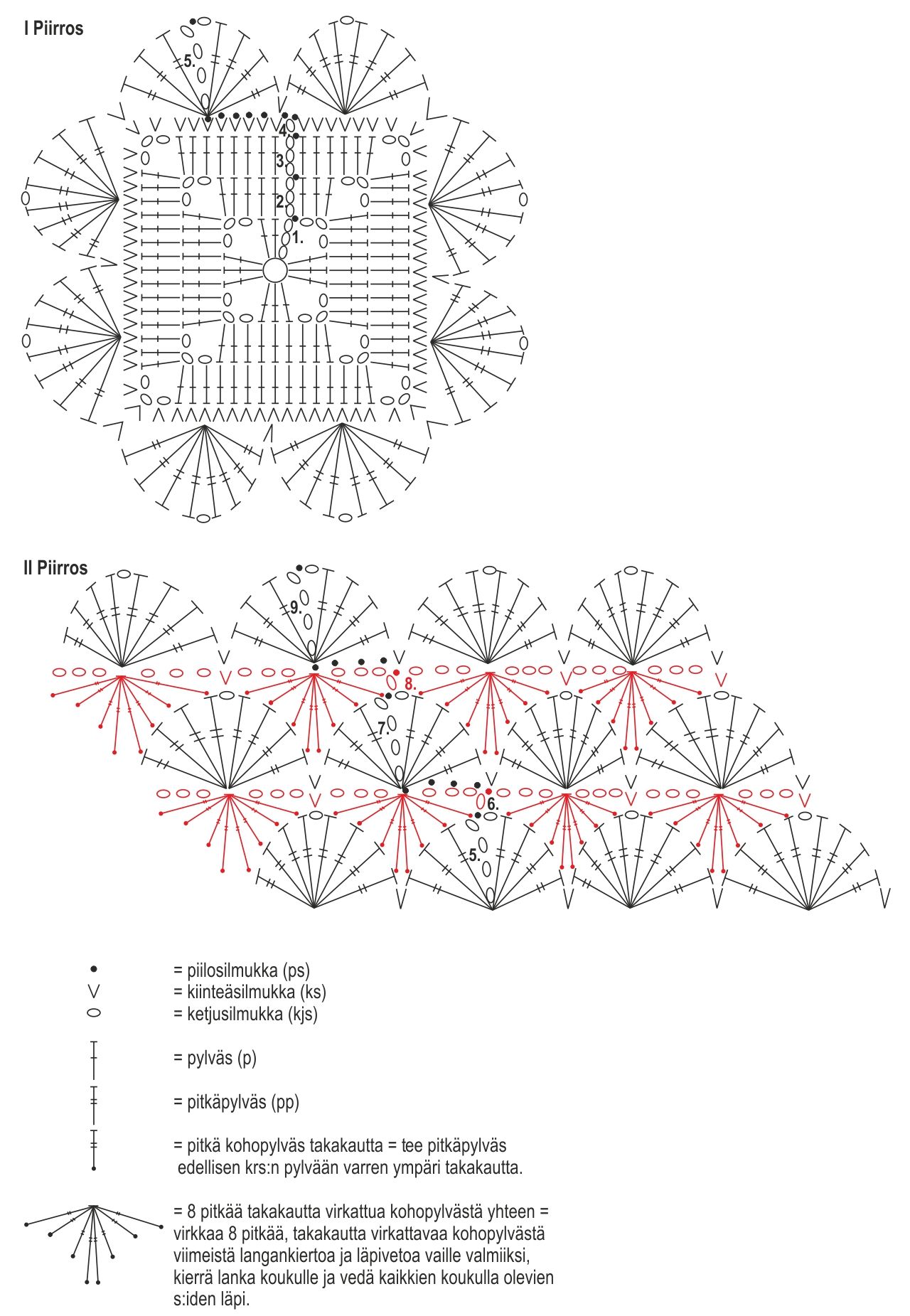 Virkkaa kiinteitä silmukoita (ks) ja pylväitä (p) ohjeen mukaan