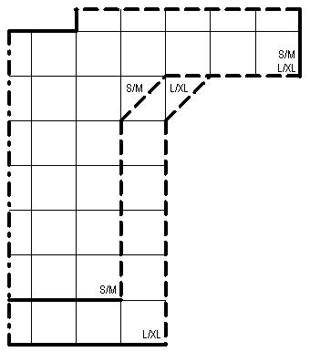 Virkkaa ja yhdistä samalla (ks.piirros) yhteensä 88(122) palaa kaavan mukaan seuraavasti: etu- ja takakappaleella on aina 5(7) palaa rinnakkain ja 6½(7½) palaa päällekkäin. Hihassa on 3 palaa rinnakkain ja 4(3) palaa päällekkäin. Kainaloiden kohdalla on 1 palat. Jätä sivuihin halkiot 1 palan matkalle. Virkkaa vielä pääntielle, helmaan ja halkion reunaan reunus piirroksen mukaan (merkitty piirrokseen sinisellä). Virkkaa vielä samanlaiset reunukset hihansuihin.