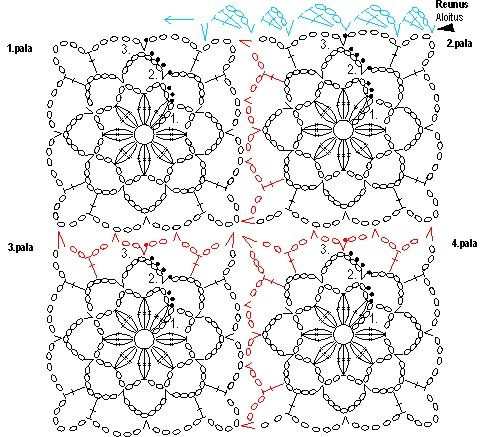 2.pala: (ks.piirros) virkkaa krs:t 1.-2. kuten 1.palassa. Yhdistä sitten 2.palan yksi sivu 1.palan sivuun 3.krs:lla virkkaamalla kjs-kaarien keskellä 1 ks 1.palan vastaavaan kohtaan (merkitty piirrokseen punaisella).
