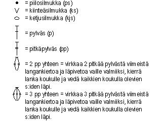 1.krs: 4 kjs, 2 yhteen virkattua pitkää pylvästä,*4 kjs, 3 yhteen virkattua pitkää pylvästä*, toista *-* vielä 6 kertaa, 4 kjs ja sulje kerros ps:lla.