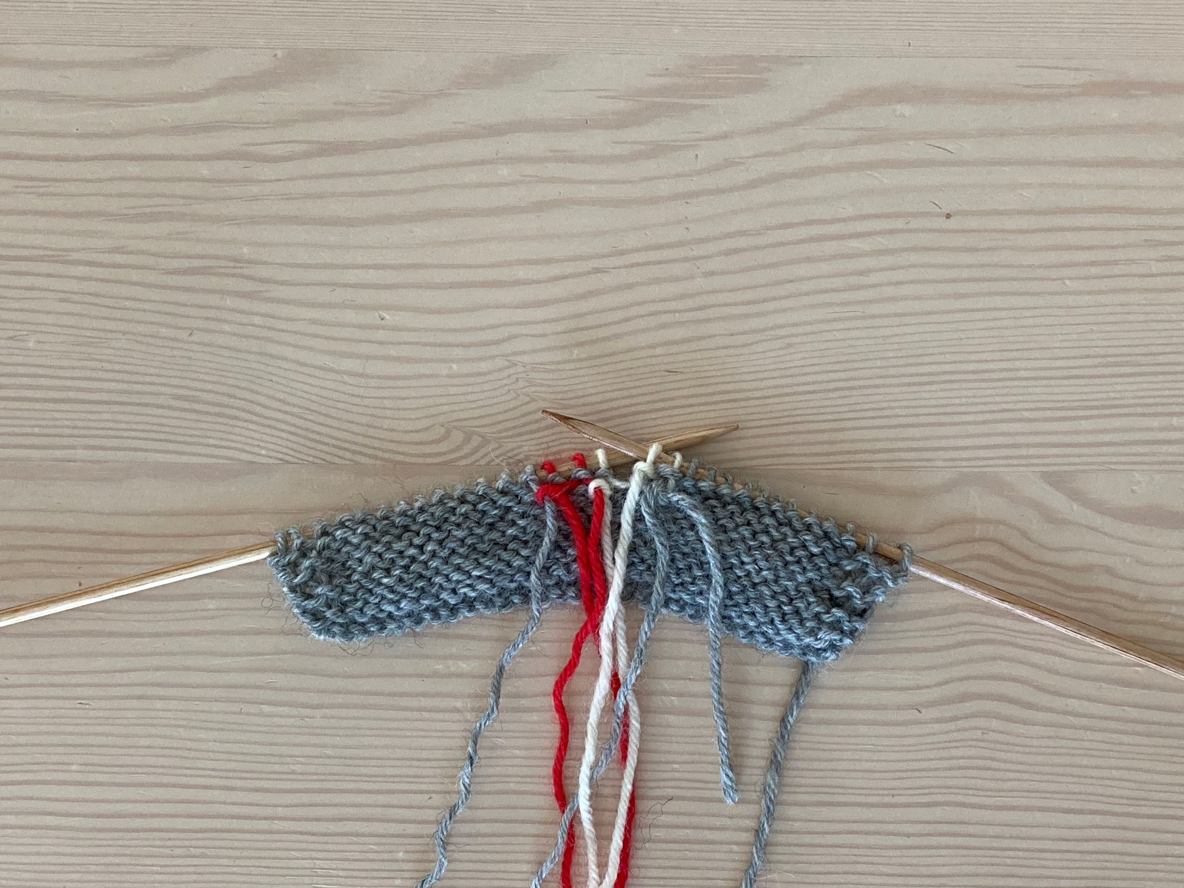 Stickningens avigsida: Sticka aviga maskor och vid färgbytet, vrid den nya tråden runt den föregående tråden. Då fäster du trådarna i olika färger och