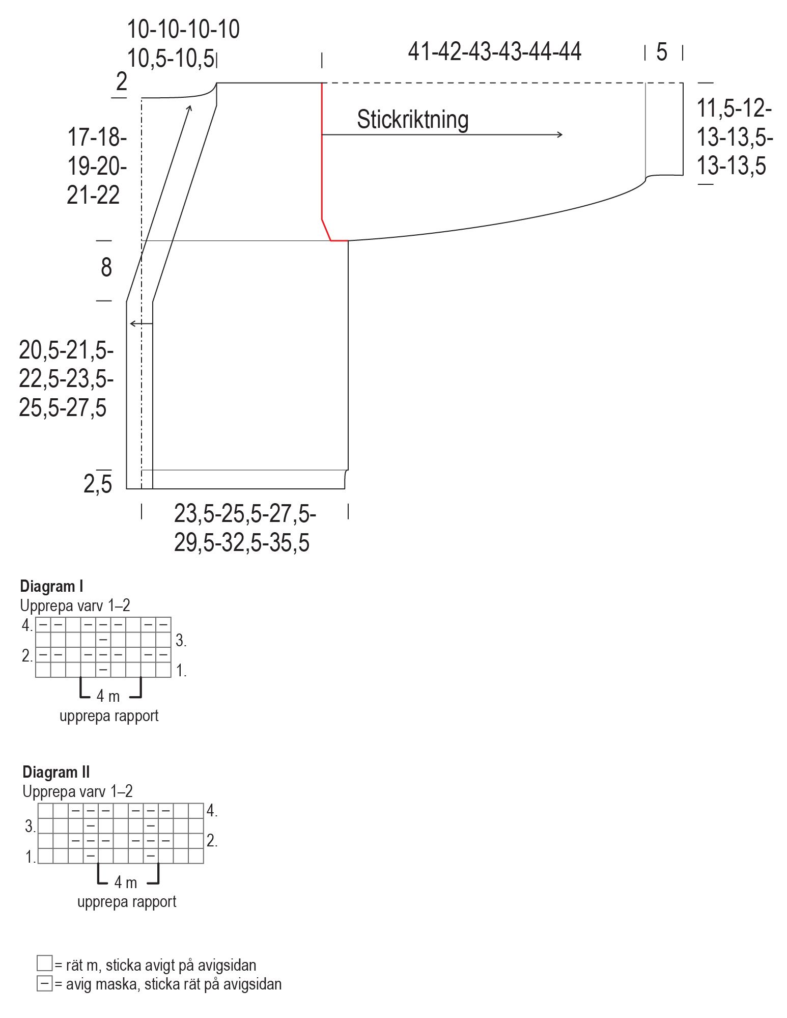 Börja med strukturstickning på avigsidan från varv 1 i diagram II: sticka 4 m från vänster i diagrammet, upprepa sedan mönsterrapporten på 4 m 18(19)20(21)22(23) gånger och sticka ännu 3 m från höger. Sticka varv 2 i diagrammet och upprepa sedan varv 1–2.