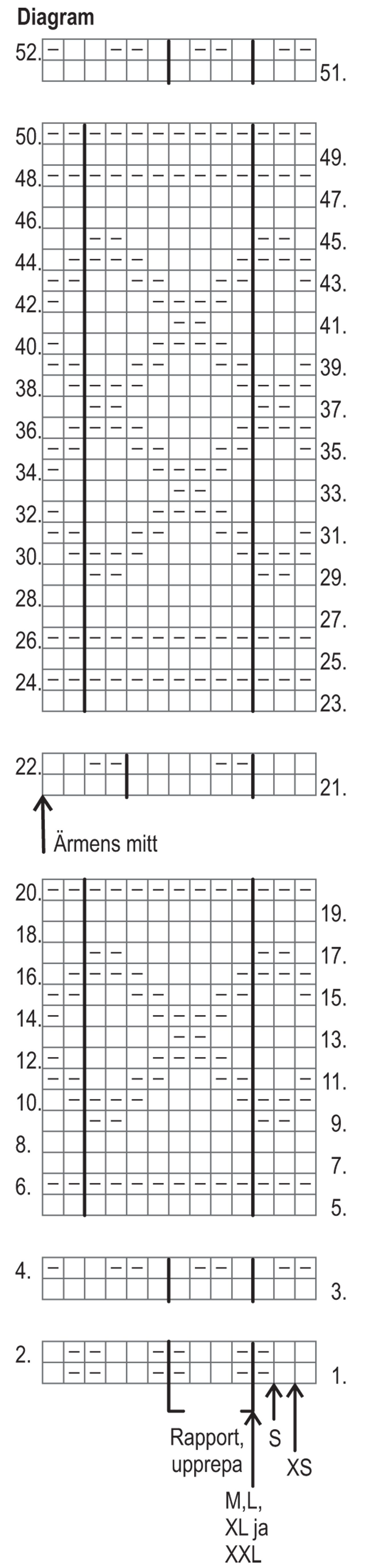 Lägg på de tunnare st upp 88(94)100(108)116(124) m och sticka 7 cm resår enl diagr, börja vid pilen för ifrågavarande storlek. Byt till de grövre st och upprepa v 3 och 4 tills arb mäter 18(19)19(20)20(21) cm. Sticka v 5-20 och upprepa därefter v 21 och 22 tills arb mäter 40(41)42(43)45(46) cm. Sticka v 23-50 och upprepa v 51 och 52 för återstoden av stycket.