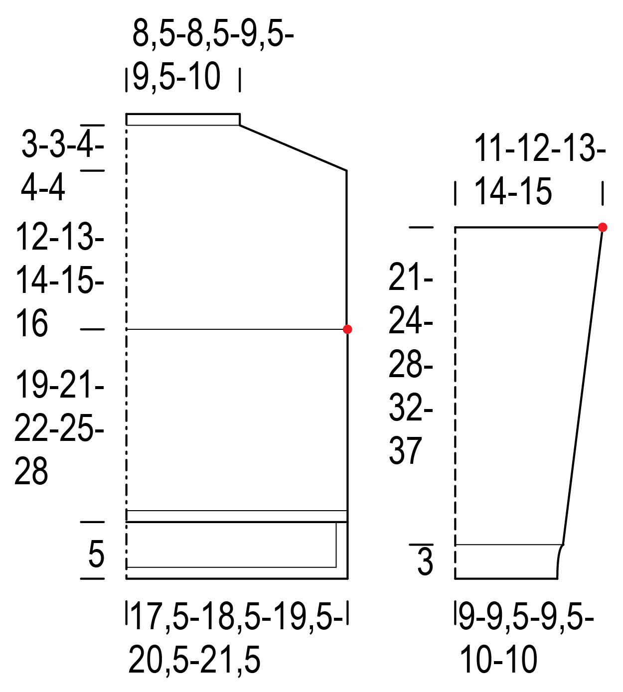 När arbetet mäter 19(21)22(25)28 cm fäst t.ex. en olikfärgad tråd i båda sidorna som markering för nederkant.