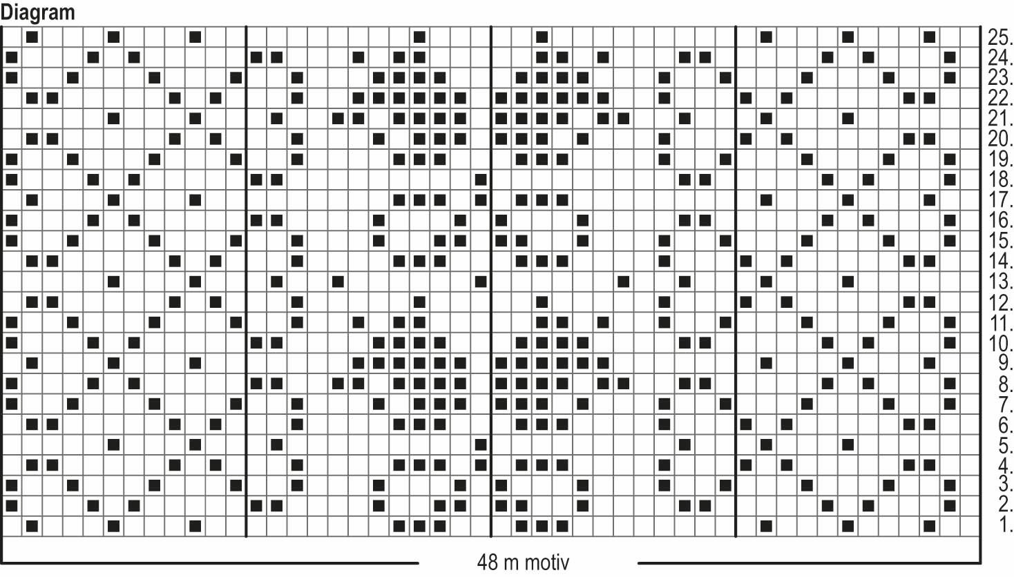 Börja med jacquardstickning från varv 1 i diagrammet och sticka mönstret på 48 m. Sticka varv 2–25 i diagrammet. Klipp av Raita-garnet. Sticka ännu 1 varv rätt med färgen marin och minska samtidigt 4 m med jämna mellanrum = 44 m.