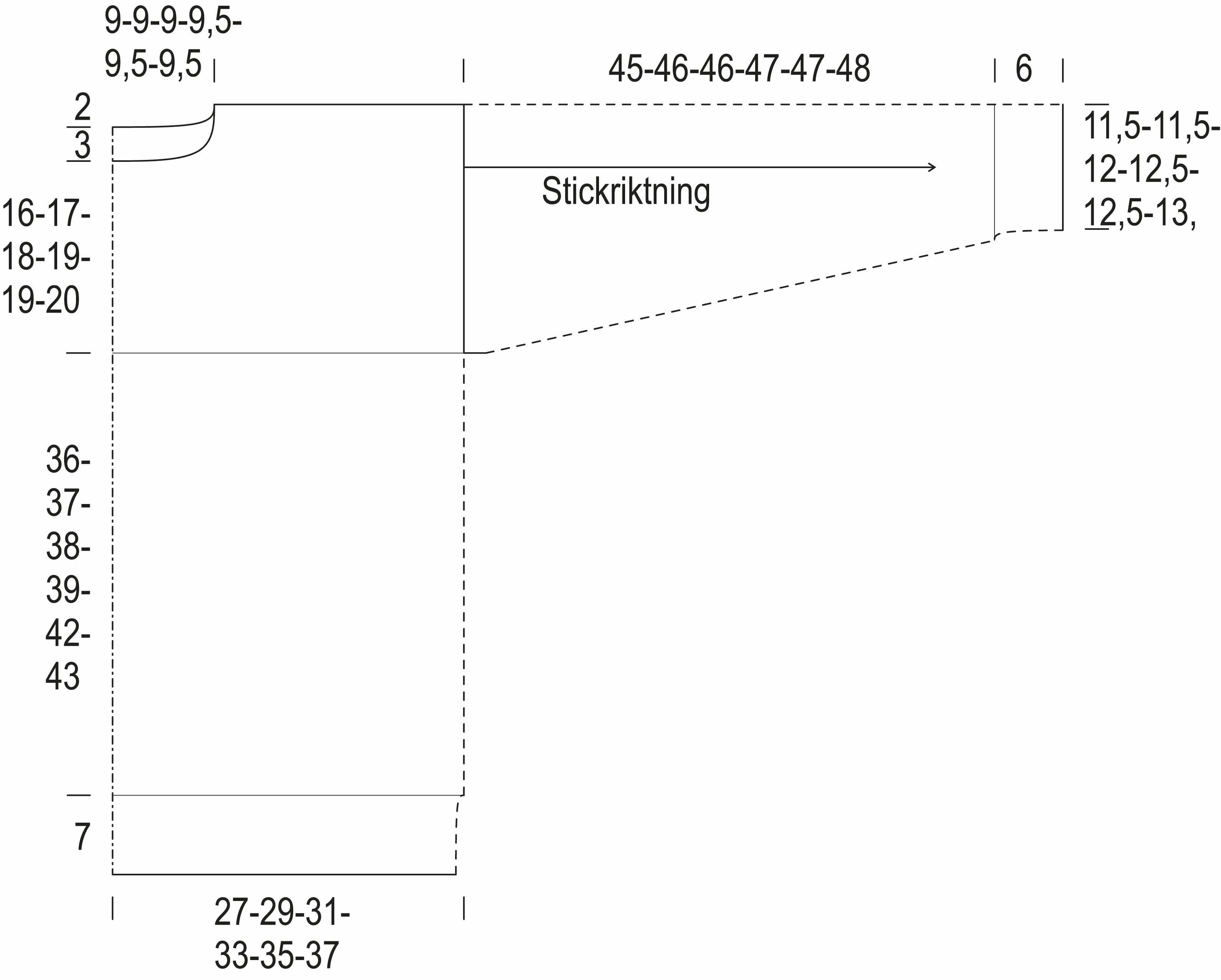 Observera Tröjan stickas runt upp till ärmhålen. Fram- och bakstyckets överdelar stickas fram och tillbaka separat. Ärmarnas maskor plockas upp längs ärmhålen och stickas runt från ärmhålen till muddarna.