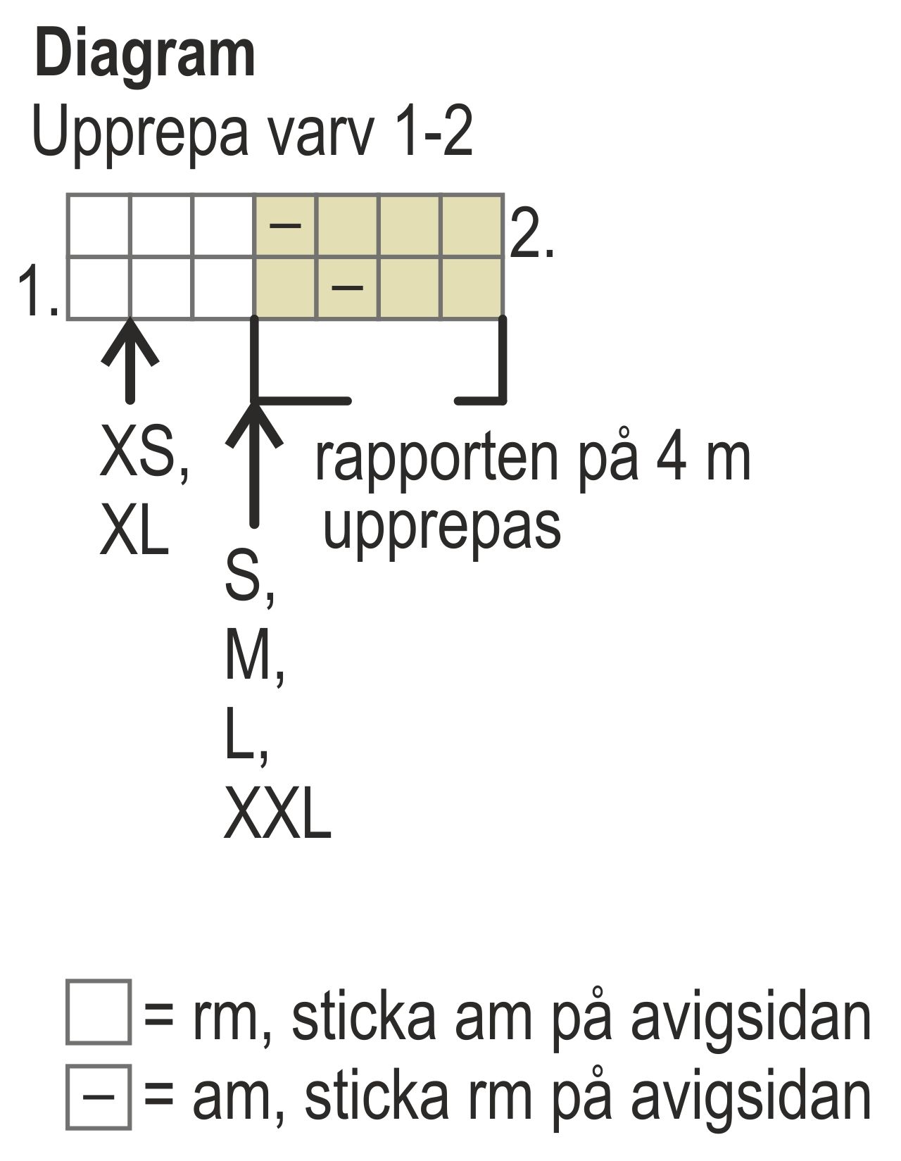 Lägg upp 58(60)62(66)70(72) m, börja med strukturstickning på avigsidan från varv 1 i diagrammet och upprepa mönsterÂrapporten på 4 m så många gånger det behövs hela varvet ut. Upprepa varv 1-2 i diagrammet.