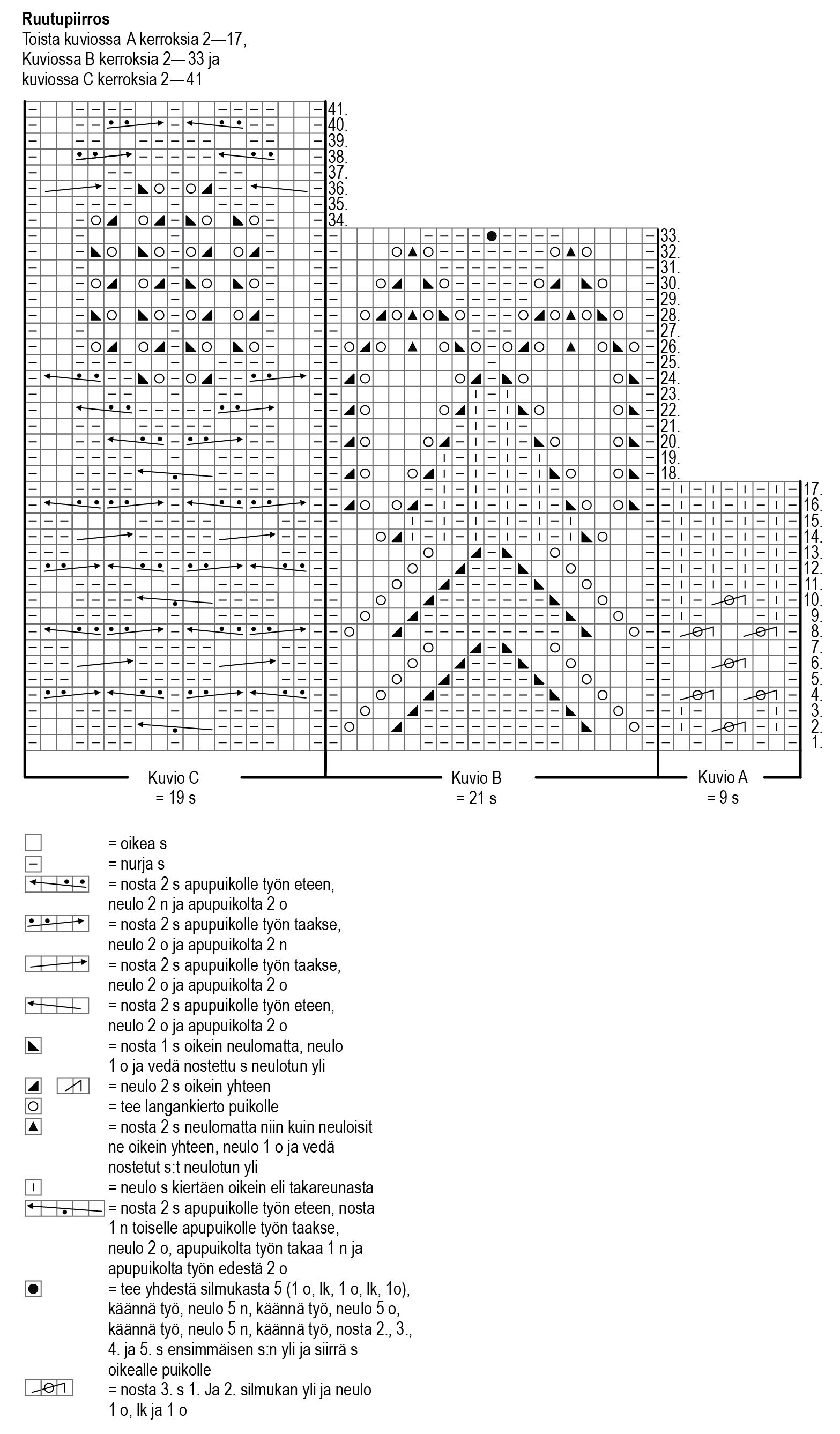 Upprepa sedan varv 2-17 vid mönster A totalt 4 gånger och sticka ännu varv 2-13. Upprepa varv 2-33 vid mönster B totalt 2 gånger och sticka ännu varv 2-13. Sticka varv 2-41 vid mönster C och sticka ännu varv 2-37.