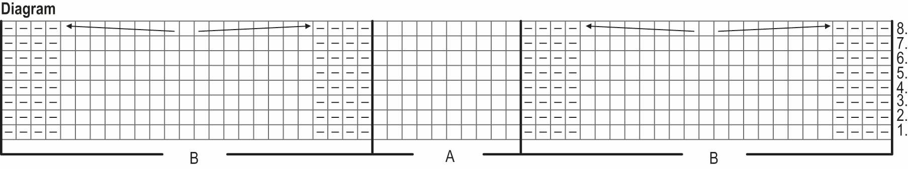Börja med flätstickning runt från varv 1 i diagrammet: sticka 0(4)8(12)18(24) am, sticka zon B i diagrammet (= 25 m), *zon A (= 10 m), zon B (= 25 m)*, upprepa *–* ännu en gång och sticka 0(4)8(12)18(24) am**. Upprepa **–**. Sticka avig slätstickning på 0(8)16(24)36(48) m i båda sidorna och i flätan varv 2–8 i diagrammet och upprepa sedan varv 1–8.