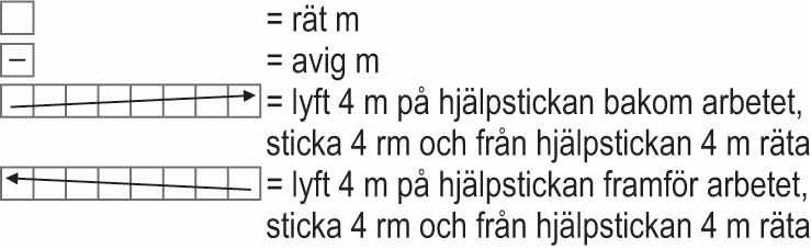Sticktekniker Slätstickning runt: sticka räta maskor på varje varv. Slätstickning fram och tillbaka: sticka räta maskor på rätsidan och aviga maskor på avigsidan. Flätstickning: sticka enligt beskrivning och diagrammet. Vriden resårstickning fram och tillbaka: Varv 1 (rs): *sticka 1 m vridet rätt, dvs. från bakre maskbågen, 1 am*, upprepa *–* tills det finns 1 m kvar, sticka 1 m vridet rätt, dvs. från bakre maskbågen. Varv 2 (as): *sticka 1 m vridet avigt, dvs. från bakre maskbågen, 1 rm*, upprepa *–* tills det finns 1 m kvar, sticka 1 m vridet avigt, dvs. från bakre maskbågen. Avig slätstickning runt: sticka aviga maskor på varje varv.