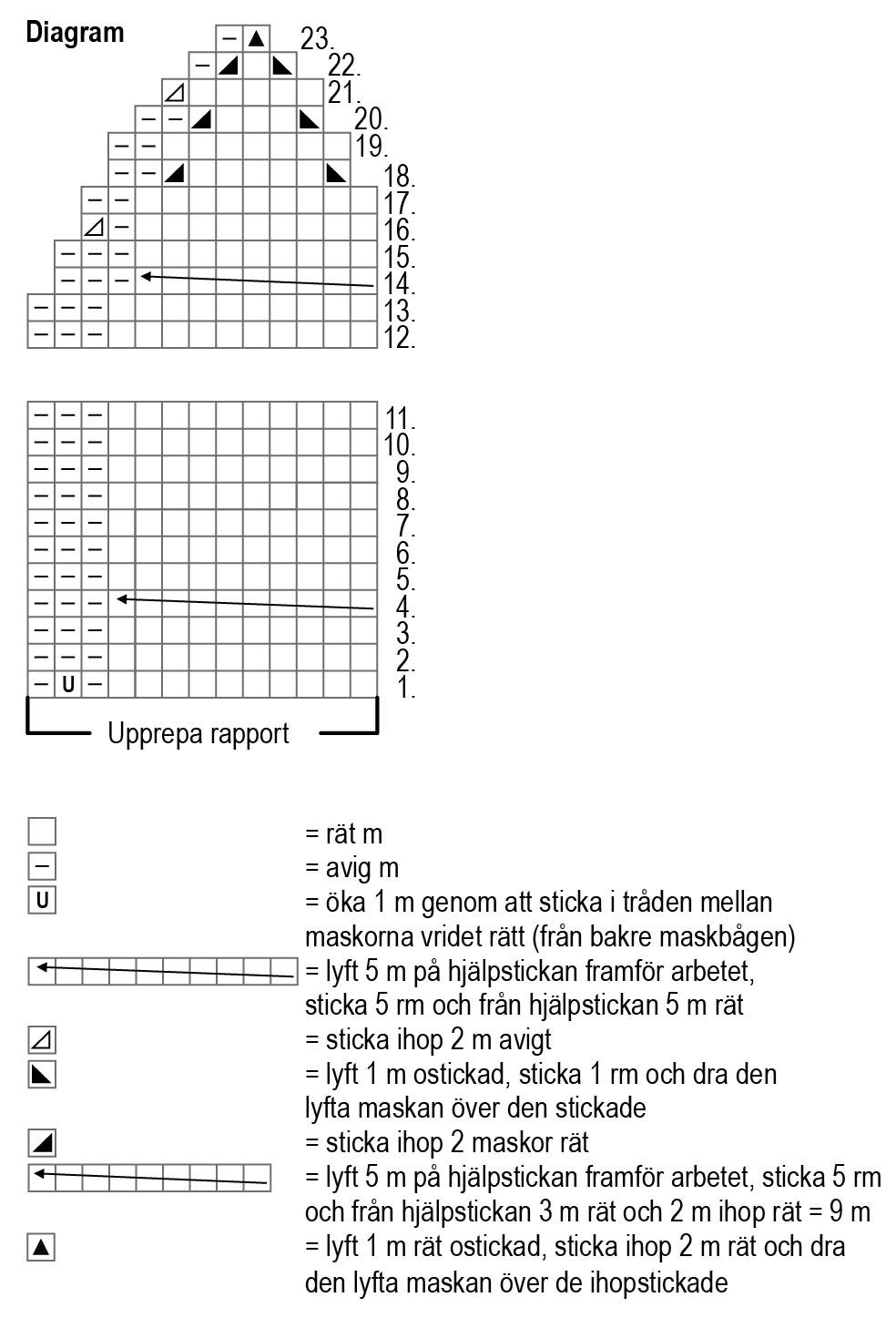 Byt till strumpstickor och sticka ännu varv 12-23 i diagrammet. Varje mönsterrapport minskas med en maska på varv 14, 16 och 21 och med två maskor på varv 18, 20, 22 och 23. Klipp av garnet och dra genom de resterande 20 m. Dra igen hålet och fäst väl på avigsidan.