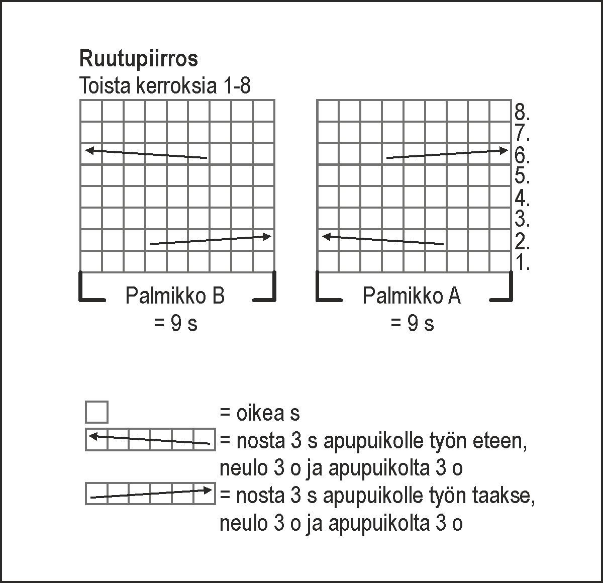 OBS! När du har stickat totalt 10 varv sticka strukturstickning i stället för resårstickning på nästa varv, dvs. varv 2 i diagrammet. När du har stickat 1 varv och nästa varv är varv 4 i diagrammet börja med öknings-/minskningsvarv vid flätorna enligt följande: sticka 17 m strukturstickning, 1 am, öka 1 m (= sticka tråden mellan maskorna vriden avig), 1 am, fläta A (= 9 m), sticka 2 am ihop, 6 m pärlstickning, 2 am ihop, fläta B (= 9 m), 1 am, öka 1 m och 1 am. Gör motsvarande ökningar och minskningar på vart 4:e varv, dvs. på varv 4 och 8 i flätmönstret, sticka alltid 2 am vid flätorna, maskorna vid strukturstickningen ökar och maskorna vid pärlstickningen minskar. Det totala antalet maskor i pulsvärmaren är hela tiden 49 m.