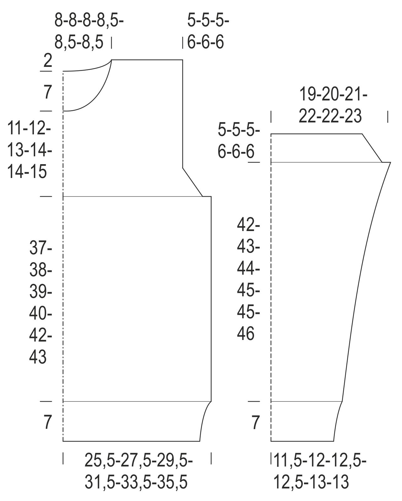 När ärmhålet mäter 20(21)22(23)23(24) cm maska av de resterande 28(32)36(37)41(45) m för axel.