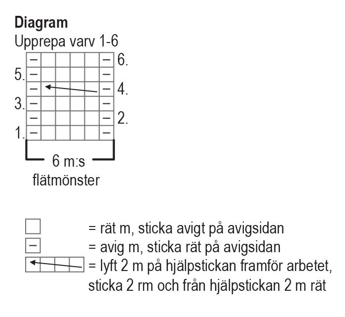 Lägg upp 42 m, börja med rätstickning och de flätstickade ränderna på avigsidan från varv 1 i diagrammet: sticka rätstickning på 6 m, *flätmönstret på 6 m, rätstickning på 6 m* och upprepa *-* ännu 2 gånger. Sticka varv 2-6 i diagrammet och upprepa sedan varv 1-6.