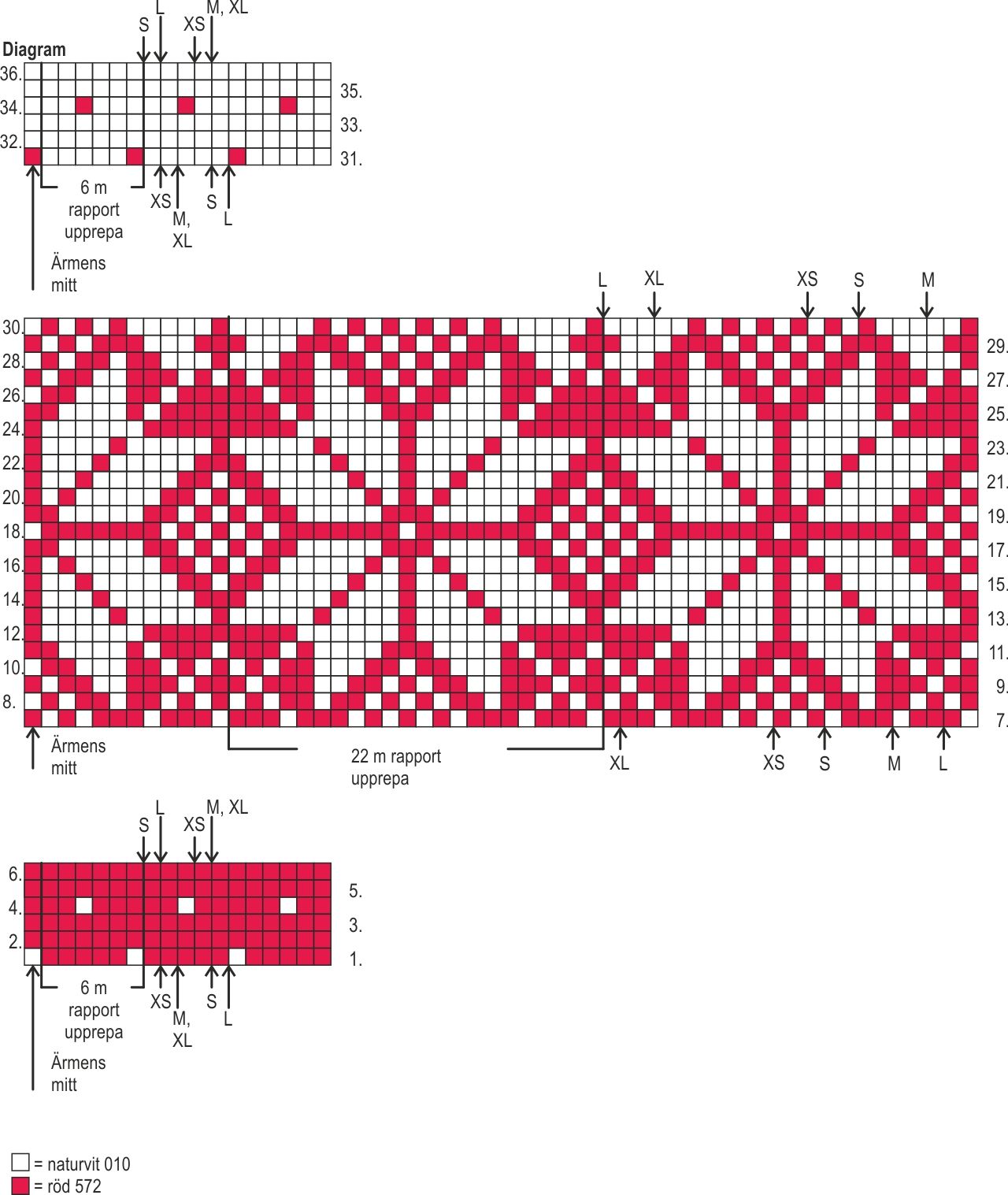 Sticka sedan 2 v slätst med n.vitt och därefter mönster från v 31 i diagr. Börja vid pilen för ifrågavarande storlek i diagr nedre kant och upprepa rapportens 6 m v ut. Upprepa v 31-36.