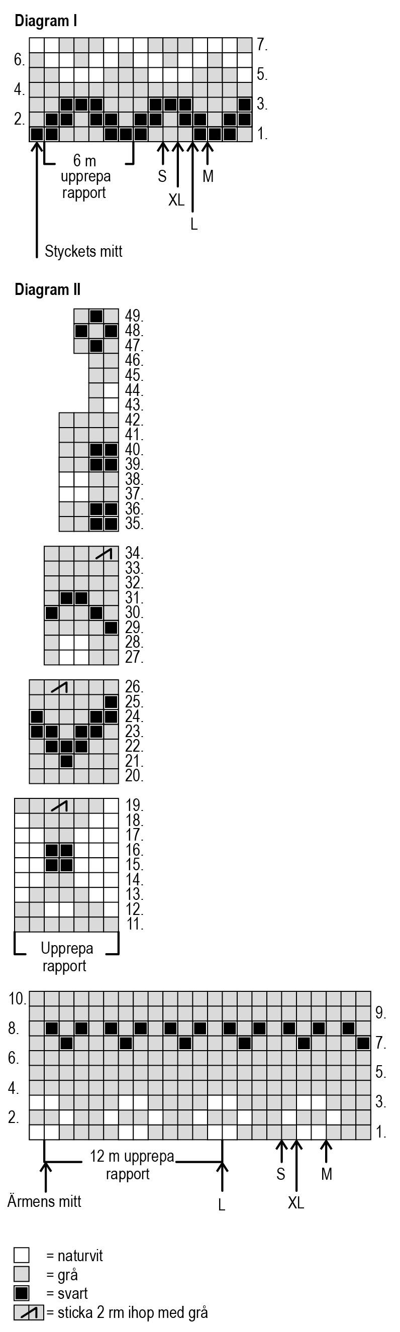 Fortsätt att sticka runt och sticka 1(1)2(2) varv rm. Sticka ännu 1 varv rm med det gråa garnet (varv 11 i diagram II) och minska 3(5)10(8) m med jämna mellanrum = 245(259)266(280) m. Börja med jacquardstickning runt från varv 12 i diagram II och upprepa mönsterrapporten på 7 m 35(37)38(40) gånger. Sticka varv 12-34 i diagrammet. Varv 19, 26 och 34 minskas alltid med 35(37)38(40) m och det finns nu 140(148)152(160) m i arbetet.