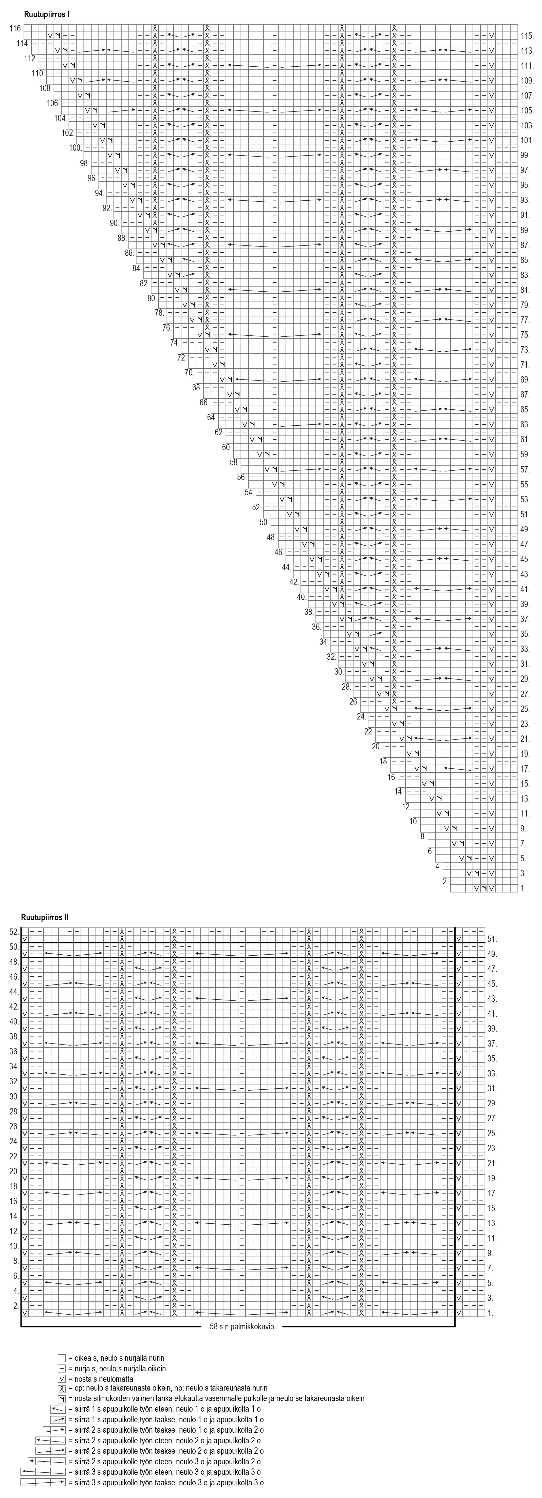 Sticka varv 2–116 i diagram I. I slutet av diagrammet finns det 66 m i arbetet: 4 kantmaskor i båda sidorna och 58 m i flätmönstret.