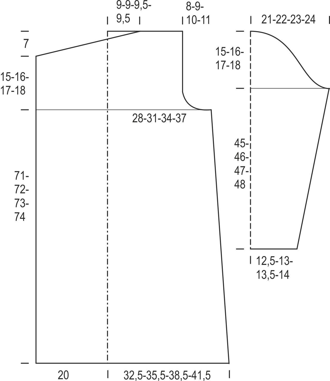 När arbetet mäter 71(72)73(74) cm maska av för ärmhål i höger sida på vartannat varv 1x4(5)5(6) m, 2x2 m och 2(2)3(3)x1 m = 49(51)54(56) m.