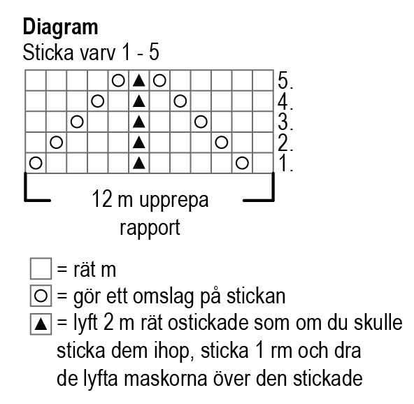 Börja med spetsstickning från varv 1 i diagrammet och upprepa mönsterrapporten på 12 m på varje sticka. Sticka varv 1-6 i diagrammet. Sticka sedan 2 varv rm, 4 varv rätstickning och ännu 2 varv rm.