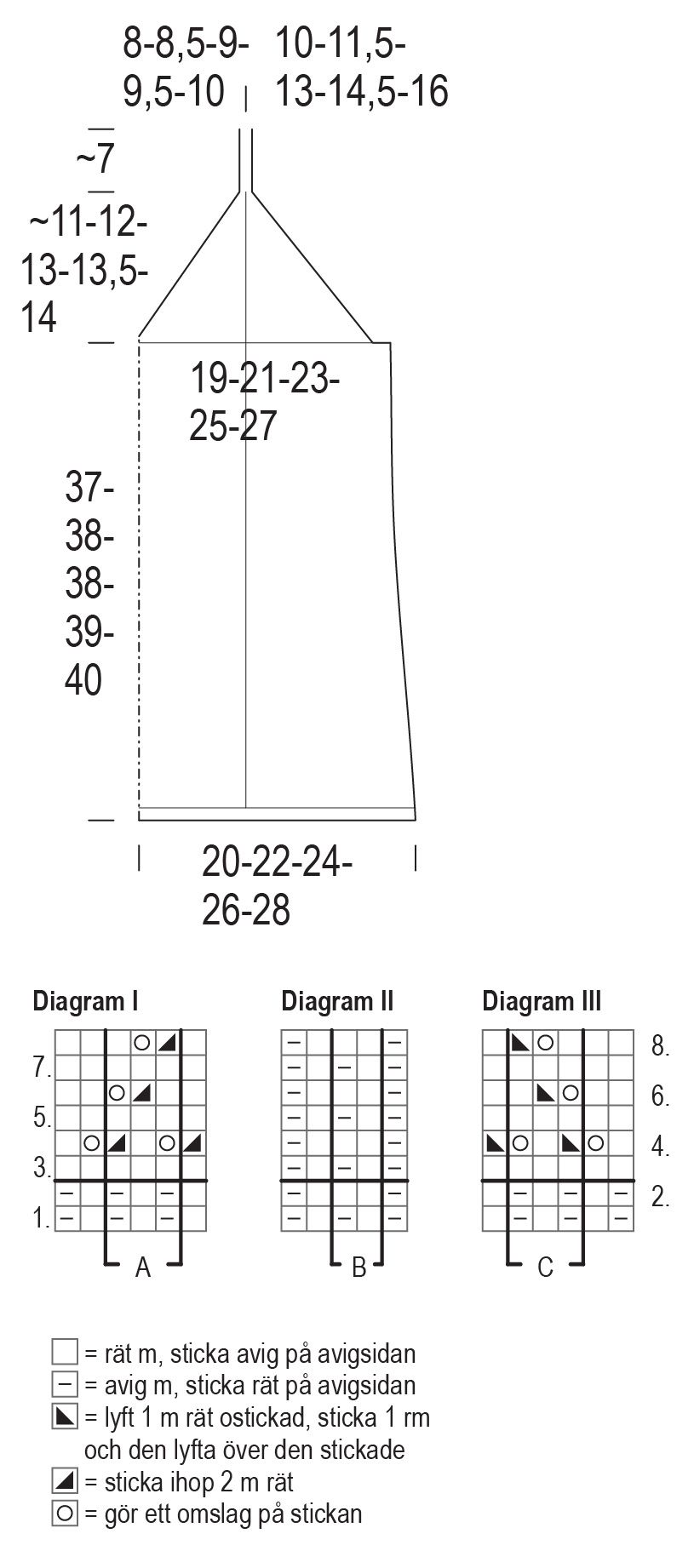 Lägg upp 85(93)101(111)119 m och börja sticka från avigsidan från varv 1 i diagrammen: sticka 2 m från vänster i diagram I, upprepa zon A 7(8)9(10)11 gånger [= 21(24)27(30)33 m], sticka 1 m i höger sida, sticka 2 m från vänster i diagram II, upprepa zon B 17(18)19(21)22 gånger [= 34(36)38(42)44 m], sticka 1 m i höger sida, sticka 1 m från vänster i diagram III, upprepa zon C 7(8)9(10)11 gånger [= 21(24)27(30)33 m] och sticka 2 m i höger sida. Sticka varv 2–8 i diagrammen och upprepa sedan varv 3–8.