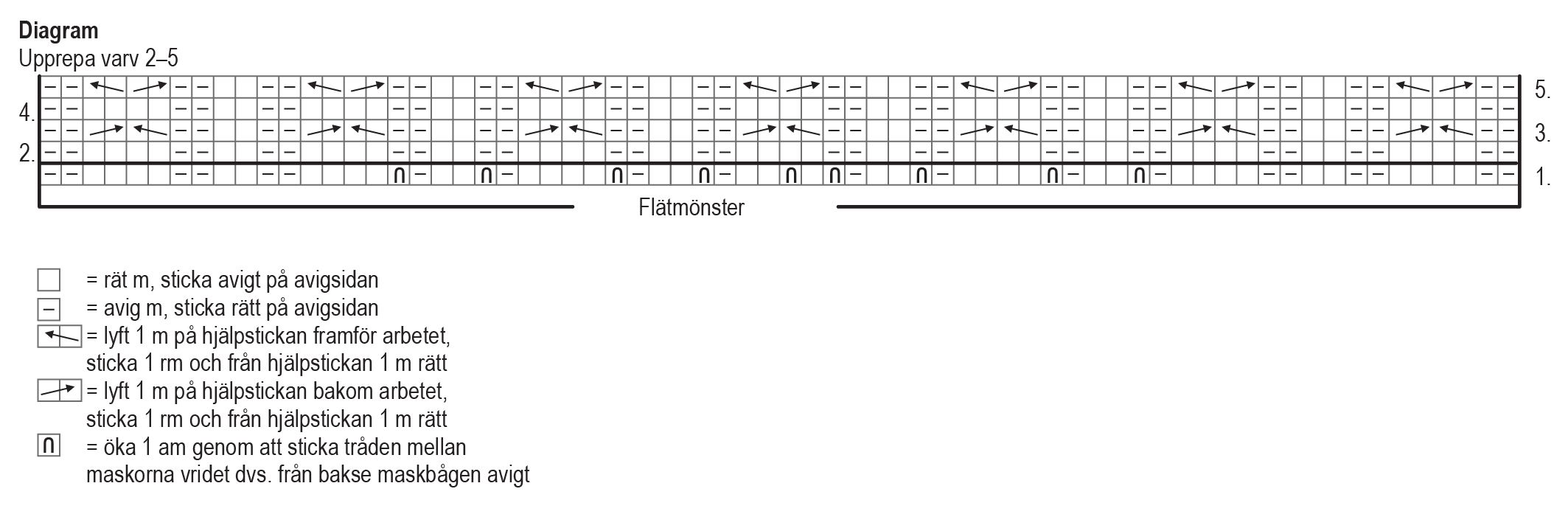 Börja med flätstickning fram och tillbaka från varv 1 i diagrammet och sticka flätmönstret. Varvet ökades med 9 m och det finns nu 68 m i arbetet. Upprepa varv 2–5 i diagrammet.