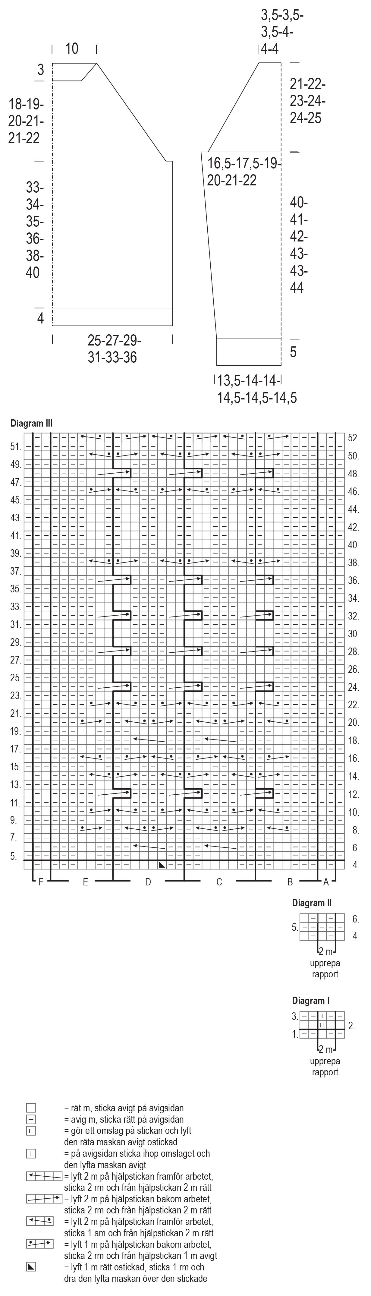 Byt till de grövre stickorna och börja med strukturstickning och flätan i mitten från varv 4 i diagram III: Sticka 1 m från höger i diagrammet, upprepa zon A 16(18)20(22)24(27) gånger [= 32(36)40(44)48(54) m], sticka zon B (= 7 m), zon C (= 8 m), zon D (= 9 - 1 m), zon C (= 8 m), zon E (= 7 m), upprepa zon F 16(18)20(22)24(27) gånger [= 32(36)40(44)48(54) m] och sticka 1 m i vänster sida. Varvet minskades med 1 m och det finns 104(112)120(128)136(148) m i arbetet. Upprepa varv 5–52 i diagrammet.