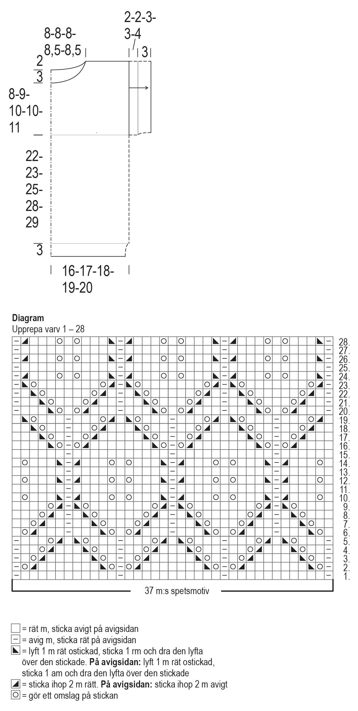 Byt till den grövre rundstickan. Börja med slätstickning och spetsstickning mitt fram från varv 1 i diagrammet: sticka 19(21)24(26)28 rm, sticka spetsmönstret på 37 m i diagrammet, sticka 19(21)24(26)28 rm, sätt en maskmarkör (sidan) och sticka rm hela varvet ut. Sticka slätstickning och vid spetsmönstret sticka varv 2–28 i diagrammet och upprepa sedan varv 1–28.