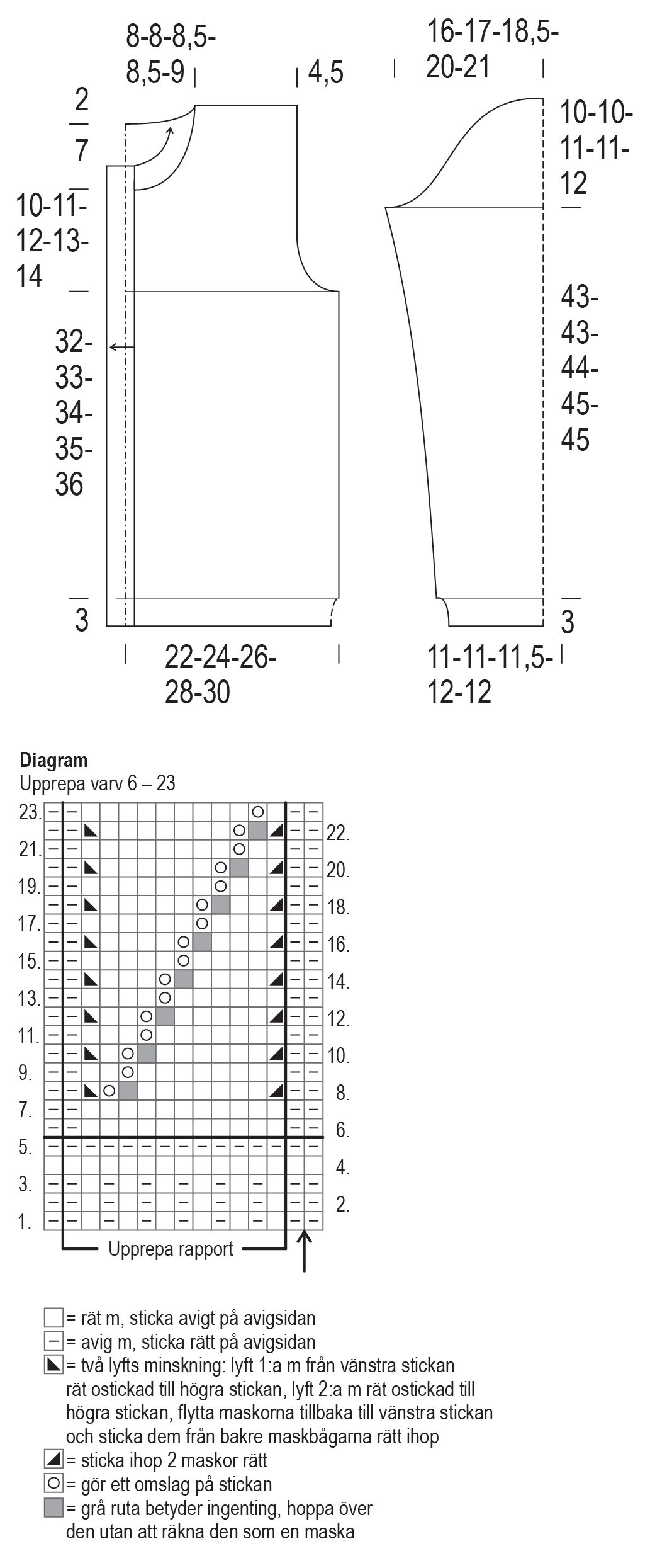 sticka enligt diagrammet och beskrivningen. Obs. För varje minskning vid spetsmönstret görs ett omslag för att antalet m ska förbli detsamma. Om den ena minskas bort, hoppa över även den andra och sticka m räta i stället.