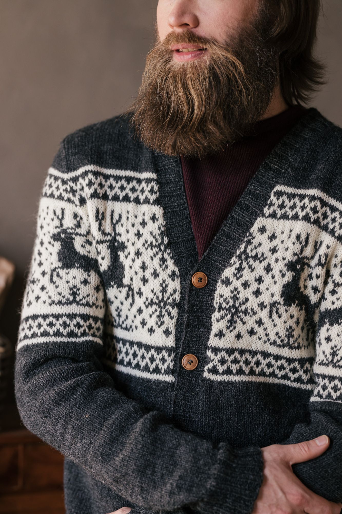 Den här stiliga herrkoftan med motiv av renar och snöflingor ger en härlig vinterstämning åt plagget. Slädfärd-koftan stickar du i Novita Nalle-garn fram och tillbaka och till sist syr du ihop delarna.