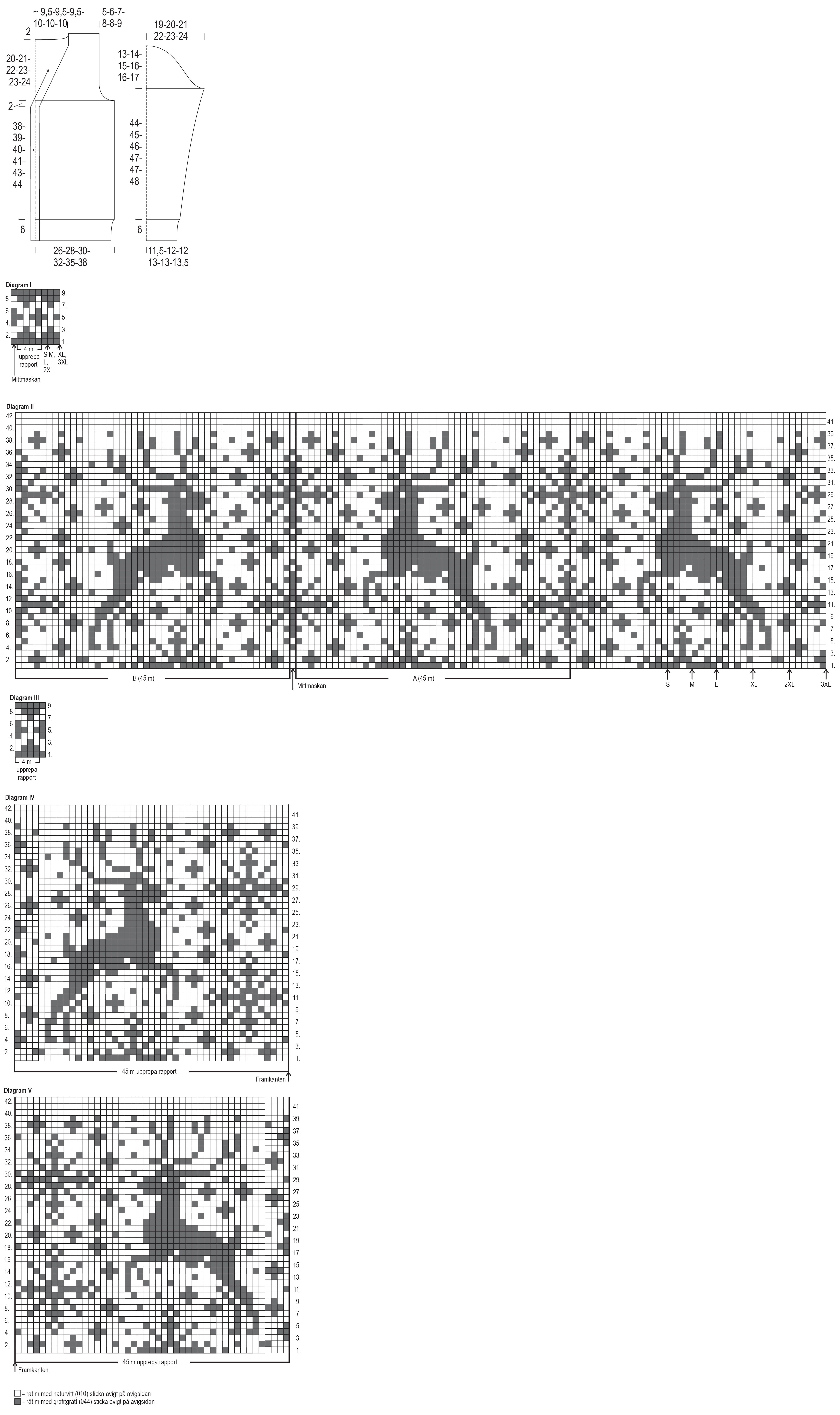 Fortsätt med jacquardstickning från varv 1 i diagram IV och upprepa mönsterrapporten på 45 m hela varvet ut så många gånger som det behövs. Sticka varv 2–42 i diagrammet.