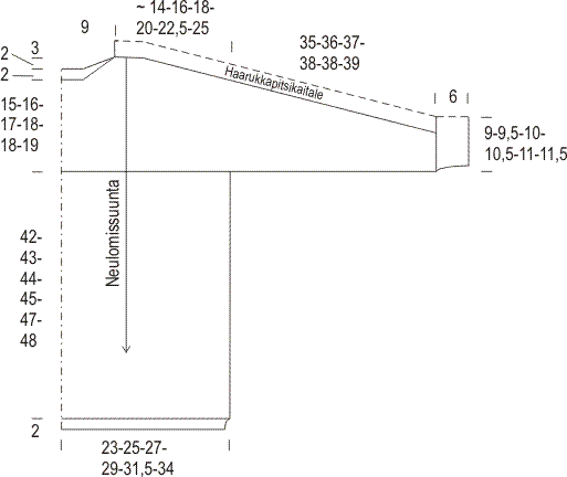 Plocka lika upp m utmed den andra axeln dvs påbörja upplockningen på rätsidan 10(12)12(14)16(18) m från halsen mot ärmhålet. Plocka upp 10(12)12(14)16(18) m, vänd arb. Sticka på avigan 10(12)12(14)16(18) am och plocka upp i slutet av v ytterl 4(4)4(4)5(5) m utmed axeln = 14(16)16(18)21(23) m. Vänd arb och sticka på rätsidan 14(16)16(18)21(23) rm och plocka upp i slutet av v ytterl 4(4)4(4)5(5) m i halsen = 18(20)20(22)26(28) m. Vänd arb och sticka på avigan 18(20)20(22)26(28) am och plocka upp i slutet av v ytterl 4(4)4(4)5(5) m utmed axeln = 22(24)24(26)31(33) m. Vänd arb och sticka på rätsidan 22(24)24(26)31(33) rm och plocka upp i slutet av v ytterl 4(4)4(4)5(5) m i halsen = 26(28)28(30)36(38) m. Vänd arb och sticka på avigan 26(28)28(30)36(38) am och plocka upp i slutet av v ytterl 4(4)4(4)5(5) m = 30(32)32(34)41(43) m. Vänd arb och sticka på rätsidan 30(32)32(34)41(43) rm och plocka upp i slutet av v ytterl 4(4)4(4)5(5) m i halsen = 34(36)36(38)46(48) m. Vänd arb och sticka på avigan 34(36)36(38)46(48) am och plocka upp i slutet av v ytterl 4(4)4(4)5(5) m = 38(40)40(42)51(53) m. Vänd arb och sticka på rätsidan 38(40)40(42)51(53) rm, plocka upp 24 m i halsen, sticka de i andra sidan vilande 34(36)36(38)46(48) m och plocka upp i slutet av v 4(4)4(4)5(5) m = 100(104)104(108)126(130) m.