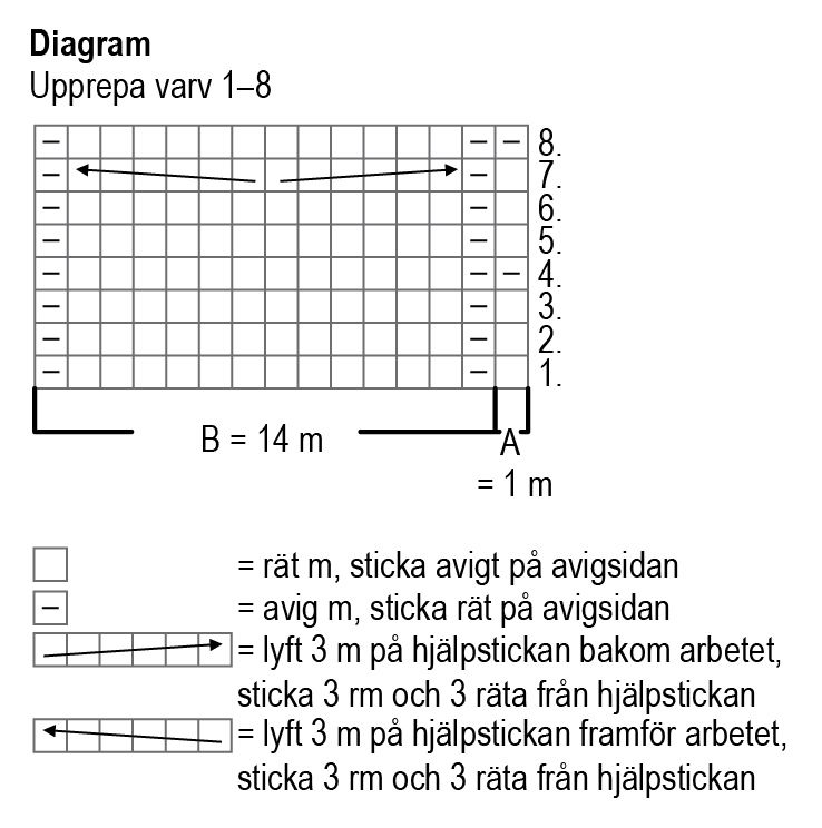Sticka 1 varv struktur- och flätstickning och börja med flätmönstret på 14 m mitt i framstycket från samma varv som du är vid bakstyckets fläta.