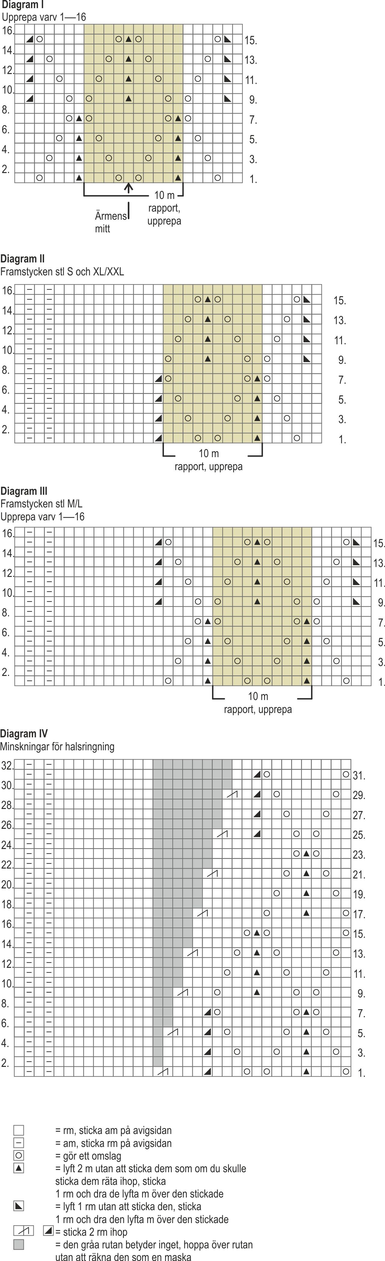 Efter att ha stickat varv 1-16 totalt 5(5)6 gånger och ännu varv 1-8(16)8 maska av för ärmhål 1x10 m i början av nästa varv och börja med minskningar för halsringning från varv 1 i diagram IV. Varvet minskades med totalt 11 m och det finns nu 40(45)50 m i arbetet. Fortsätt med minskningar för halsringning genom att sticka varv 2-32 i diagrammet och fortsätt därefter med minskningar på samma sätt på vart 4:e varv tills du har minskat totalt 12 m.