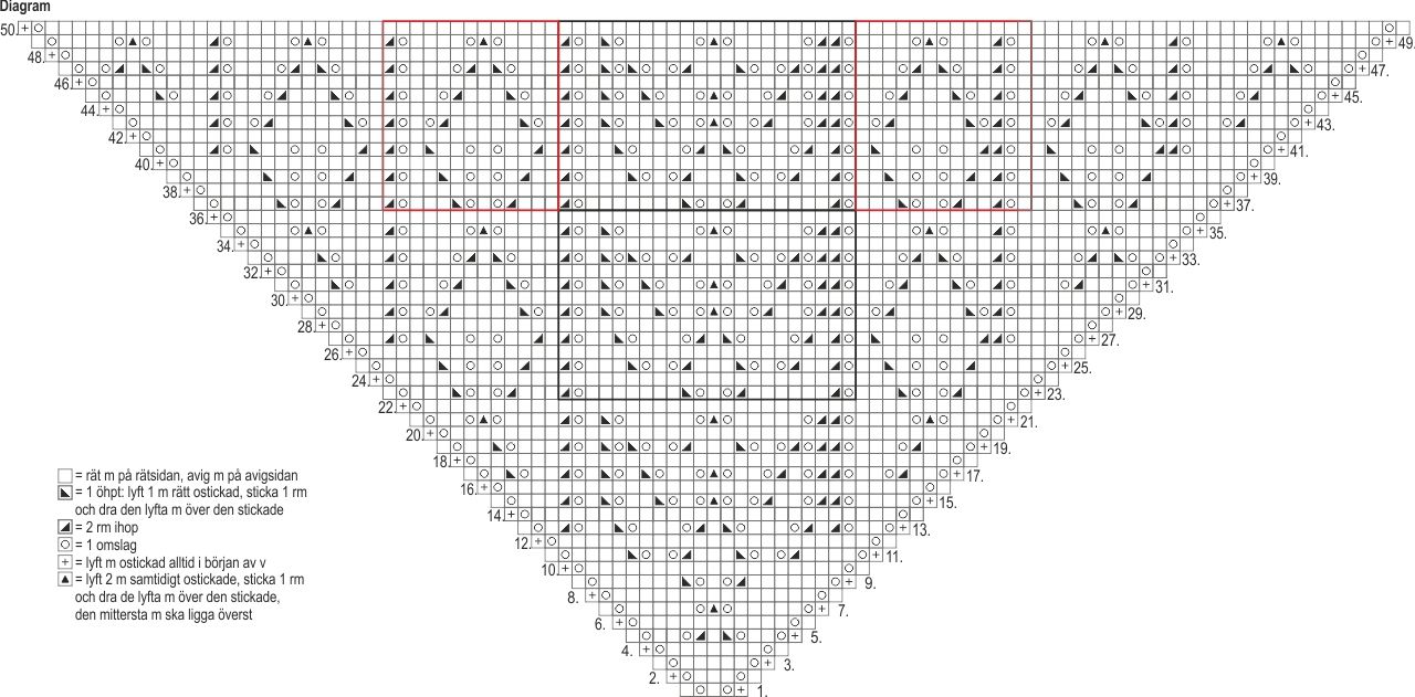 Fortsätt i spetsmönster och ökningarna på samma sätt. Sticka de ökade m med i spetsmönstret varvid mönstret på 14 v alltid utökas med en ny snedruta i vardera sidan (markerade med rött på diagr) på samma sätt som på v 37-50.