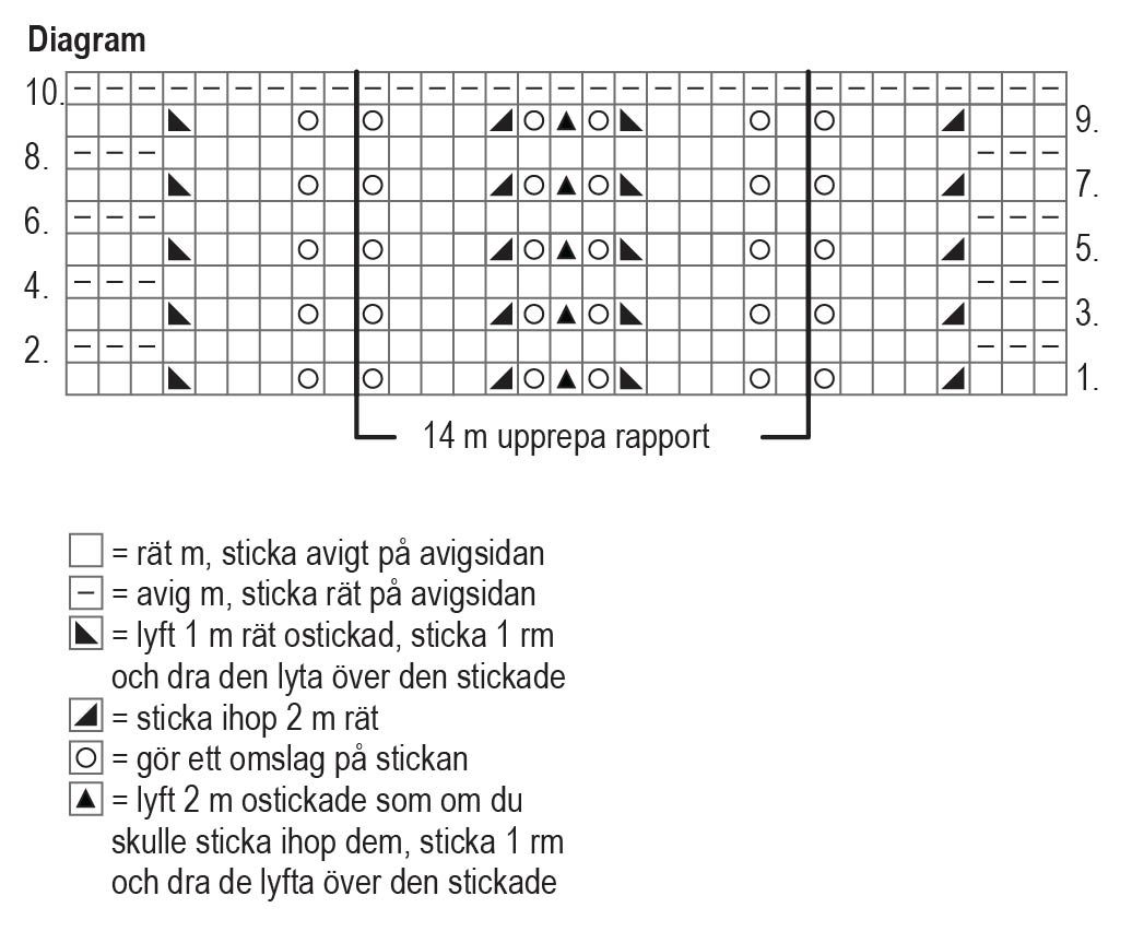 Lägg upp 213 m och sticka 3 varv rätstickning. Börja med spetsstickning från varv 1 i diagrammet: sticka 8 m från höger i diagrammet, upprepa sedan mönsterrapporten på 14 m 14 gånger och sticka ännu 9 m i vänster sida. Sticka varv 2-10 i diagrammet och upprepa sedan varv 1-10.