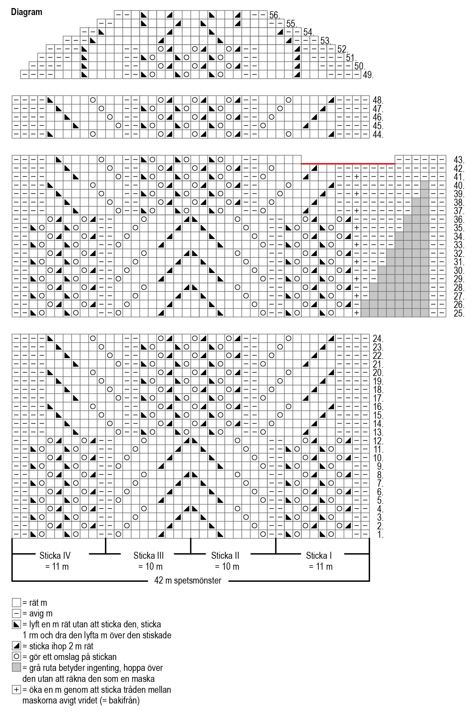 Sticka varv 43 i diagrammet: sticka 6 am från början av varvet, flytta nästa 11 m (markerade med rött i diagrammet) t.ex. på en tråd för tumme, lägg upp 2 m till i stället för de som flyttats på en tråd och sticka hela varvet ut enligt diagrammet. Det finns nu 42 m i arbetet.
