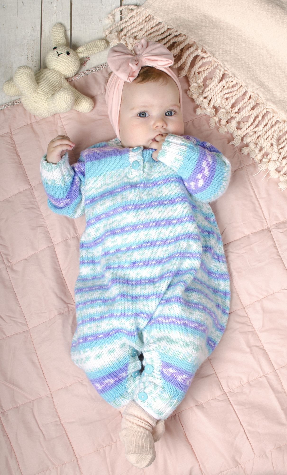 Bedårande babyoverall i Novita Niitty garn. Du kan också sticka den i Novita Keto garn om du vill göra den enfärgad eftersom garnens masktäthet är den samma.