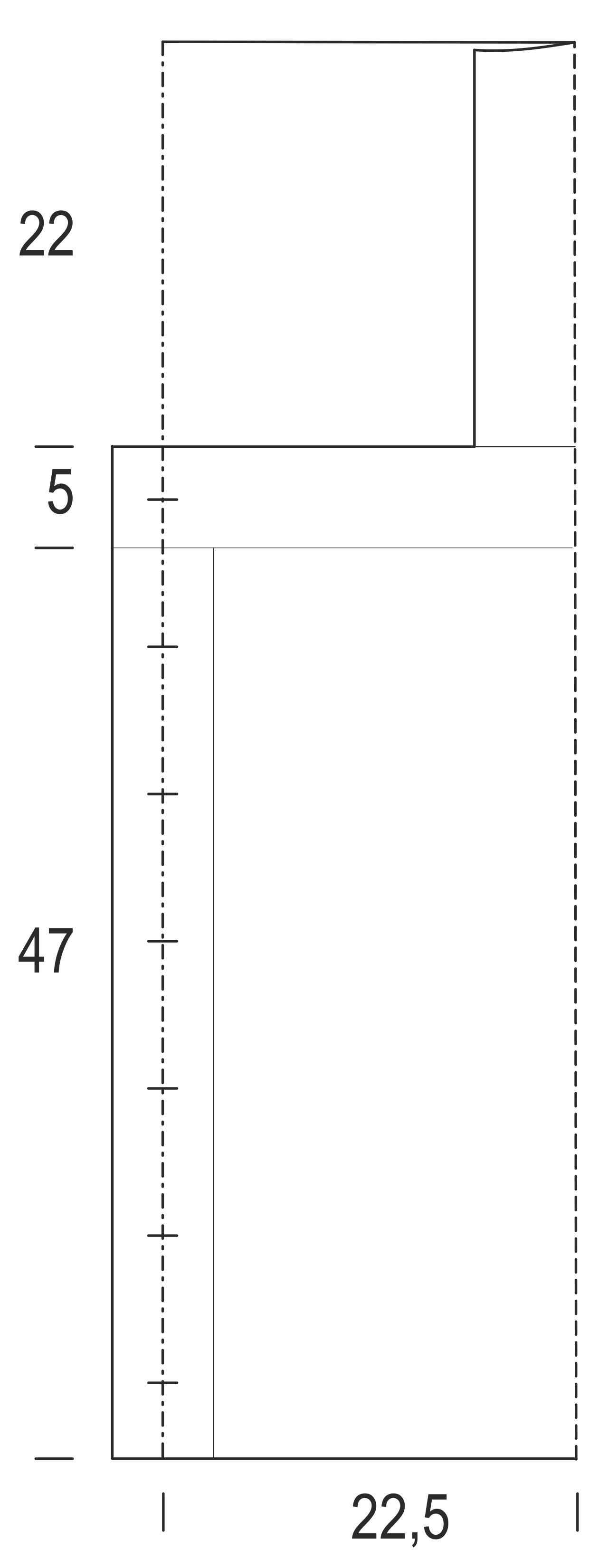 OBS! När arbetet mäter 5 cm gör det första knapphålet i vänster sida enligt följande: när det finns 5 m kvar på rätvarvet flytta 2 m från vänster till höger sticka. Dra den högra maskan av de m som flyttats till höger sticka över den vänstra, flytta ännu 1 m från vänster till höger sticka och dra den högra m över den vänstra. Flytta m tillbaka till vänster, lägg upp 2 nya m i stället för de minskade maskorna och sticka hela varvet ut. Gör ännu 5 knapphål med 7,5 cm mellanrum.