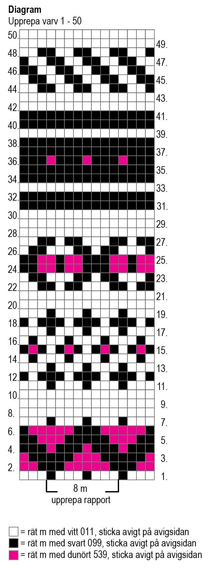 Börja med mönsterstickning från varv 1 i diagrammet: sticka 4 m från höger i diagrammet, upprepa mönsterrapporten på 8 m 10(11)12(13)14(15) gånger och sticka ännu 3 m från vänster. Sticka varv 2-50 i diagrammet och upprepa sedan varv 1-50.