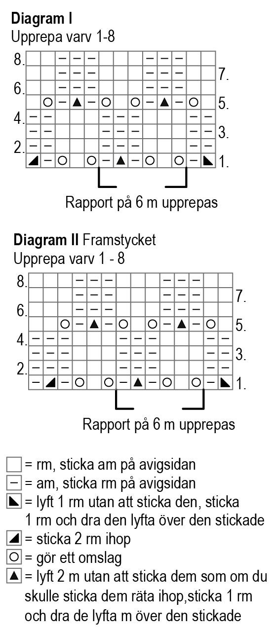 Byt till de grövre stickorna och börja med strukturstickning från Diagram ll varv 1: sticka 2 m från höger i diagrammet, upprepa sedan mönsterrapporten på 6 m 6(6)7(7)8 gånger, sticka vänstra kantens 6 m och sticka 6 m rätstickning. Upprepa varv 1-8 i diagrammets strukturstickning.
