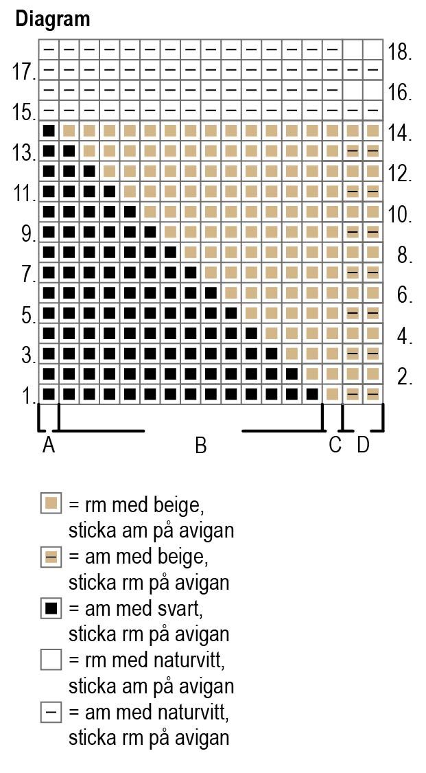 Börja med intarsiamönstret med det svarta garnet i vänster sida från varv 1 i diagrammet: upprepa zon A från vänster i diagrammet (= 1 m) på 15(17)19(21)23(25) m, sticka zon B (= 13 m), upprepa zon C (= 1 m) på 30(32)34(37)40(44) m och sticka zon D (= 2 m). Upprepa varv 1-18 i diagrammet.