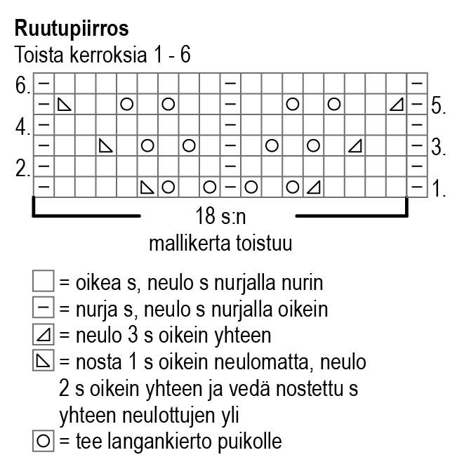 Fortsätt i spetsmönster enl diagr från v 1 så här: sticka den 1:a m i höger kant och upprepa sedan 6(7)8(9) x rapportens 18 m. Upprepa v 1-6.