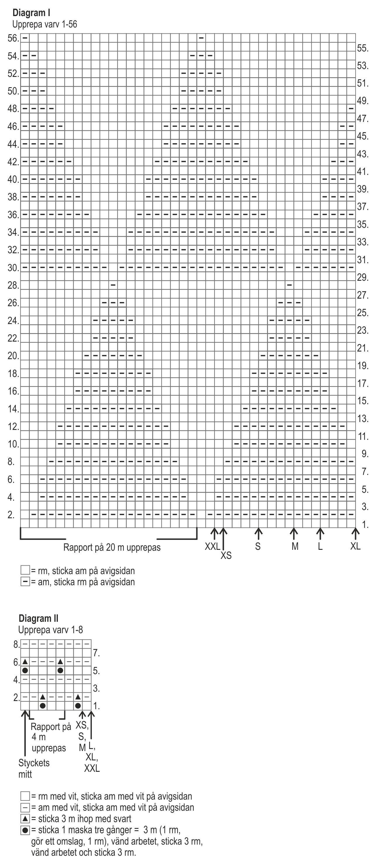 Börja med strukturstickning från varv 1 i diagram I, varje storlek från respektive markering, och upprepa sedan mönsterrapporten på 20 m hela varvet ut så många gånger det behövs. Upprepa varv 1-56 i diagrammet totalt 1(1)1(2)2(2) gånger och sticka därefter ännu varv 1-55(55)55(27)27(27).