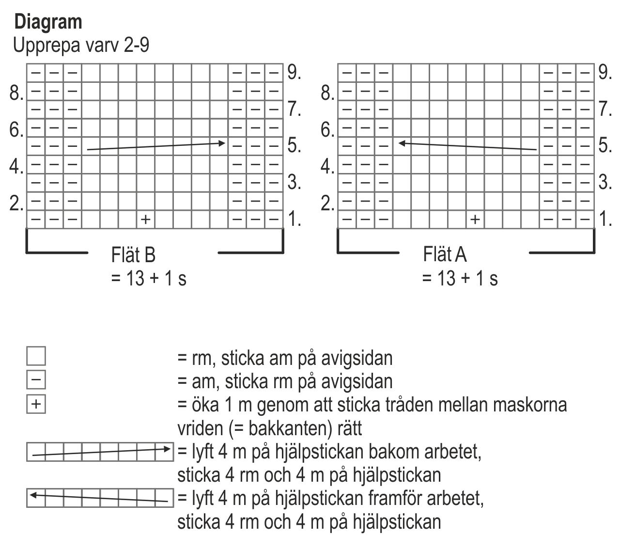 Efter att ha stickat 3 varv resårstickning börja med flätränder på rätvarvet från varv 1 i diagrammet enligt följande: fortsätt med resårstickning på 5 m, sticka 10(12)14(16)18 m rät slätstickning, fläta A från diagrammet