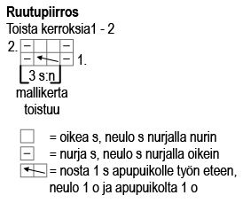 Stickor Novita nr 4½ och 5 eller enligt handlag samt rundsticka (40 cm) Novita nr 4½ till halsringning och hjälpsticka till flätstickning